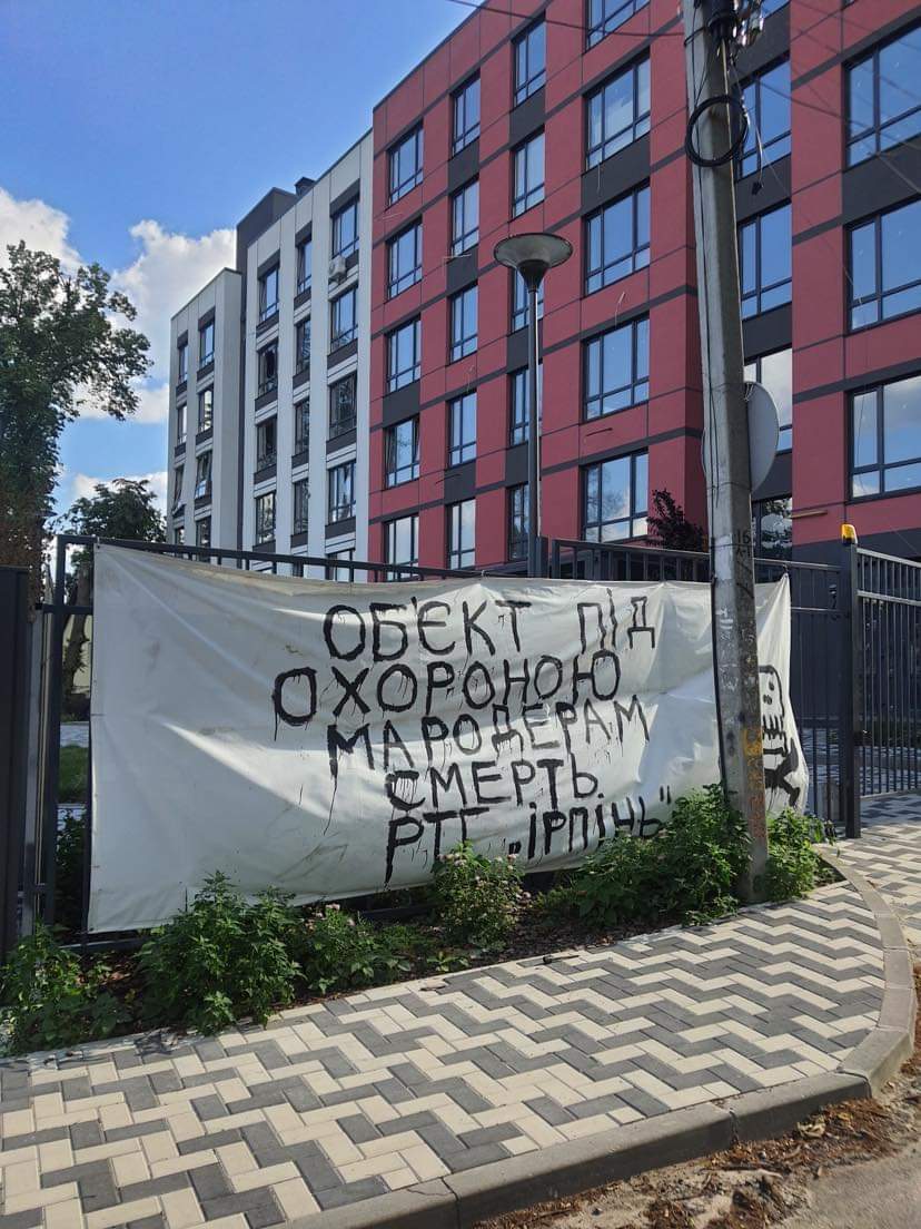 イルピンの様子。布には、「その建物はセキュリティがあります。泥棒がくれば、死ぬ。」と書かれている。本当に泥棒がいるわけではなく、警戒・警告の意味で書いてあるそうだ。きつい表現からは、人々の心がすさんでいることがうかがわれる。